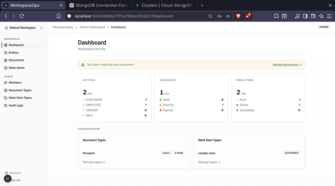 Clean-architecture backend for managing workspace entities, documents with expiry tracking, work items, and audit logs with RBAC security and real-time updates.